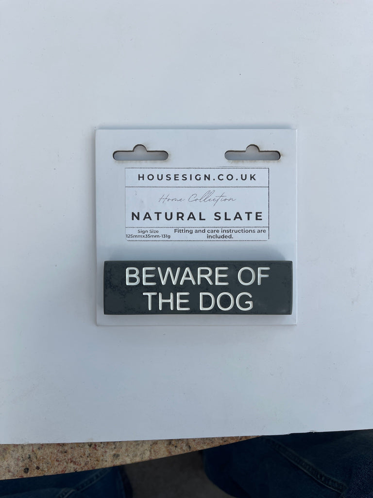 This sign features the phrase "BEWARE OF THE DOG” as depicted in the images. Made from durable Natural Slate, the lettering is expertly carved into the surface for long-lasting visibility.